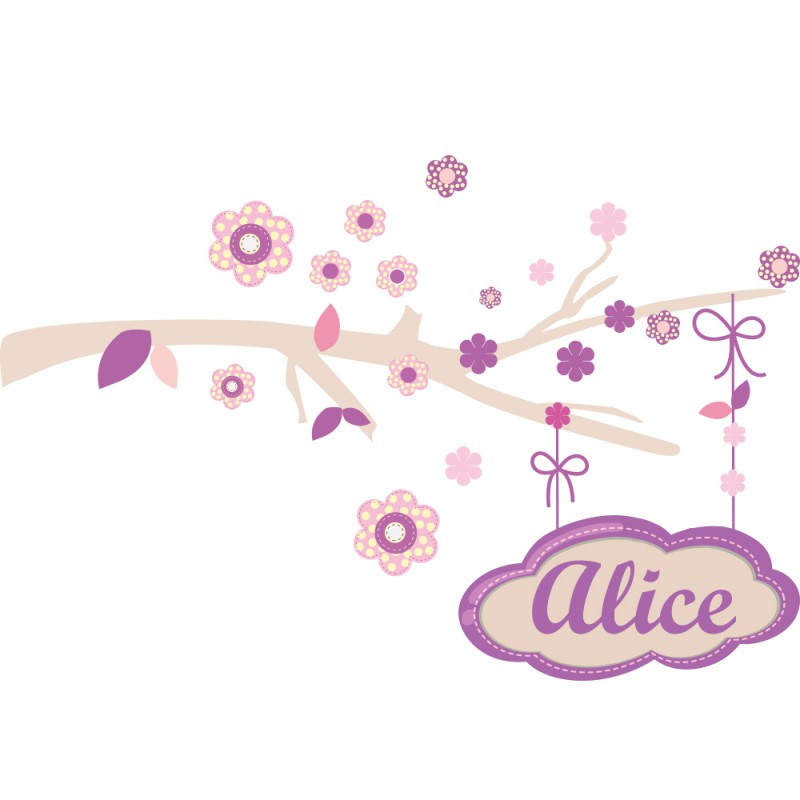 Indiquez le prénom de votre petite fille et recevez votre branche fleurie et personnalisée. Les jolies petites fleurs, dans les tons de roses, mauves et violets, les feuilles dans les mêmes tons créeront une ambiance douce dans la chambre d'une petite fille.
